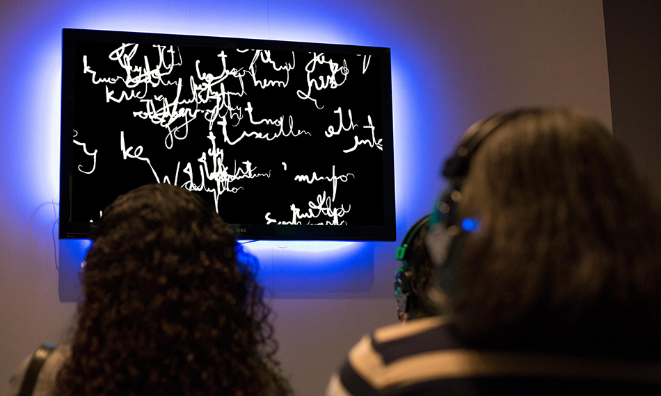 The video displays all the words that comprise this poem, moving across the screen. The words were handwritten, digitized and coded, in order to function as animated organisms.