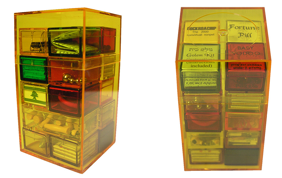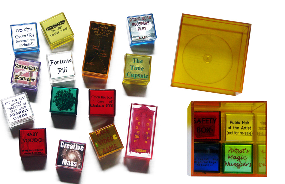 The Artbox is comprised of 18 modular works enclosed in small Plexiglas boxes of different colors. This work emerged with the intention of capturing the zeitgeist or spirit of the times, driving the creation of a portable and playable museum based in the most relevant cultural icons of the year 2000. All the physical elements were obtained or manufactured in New York City.