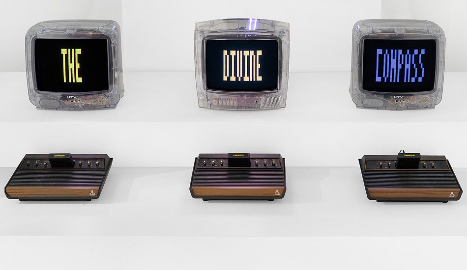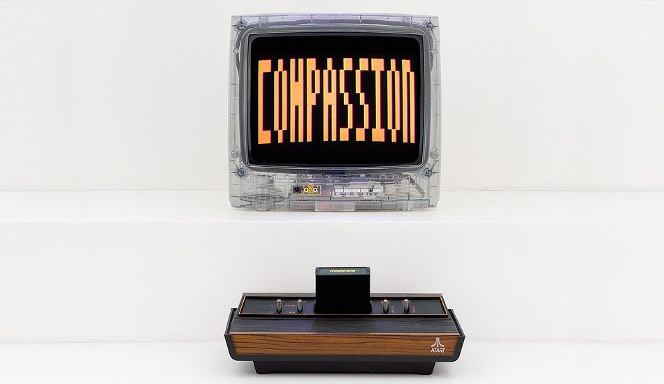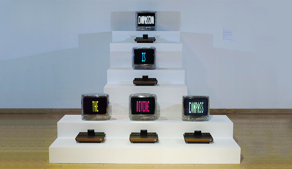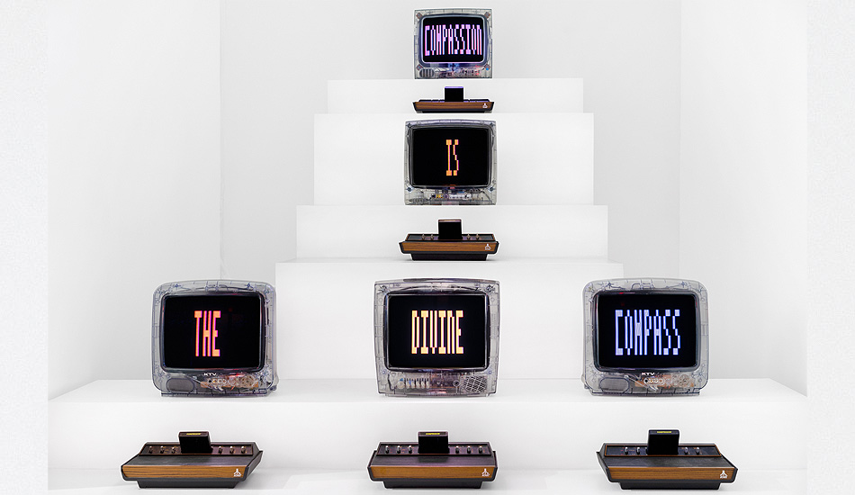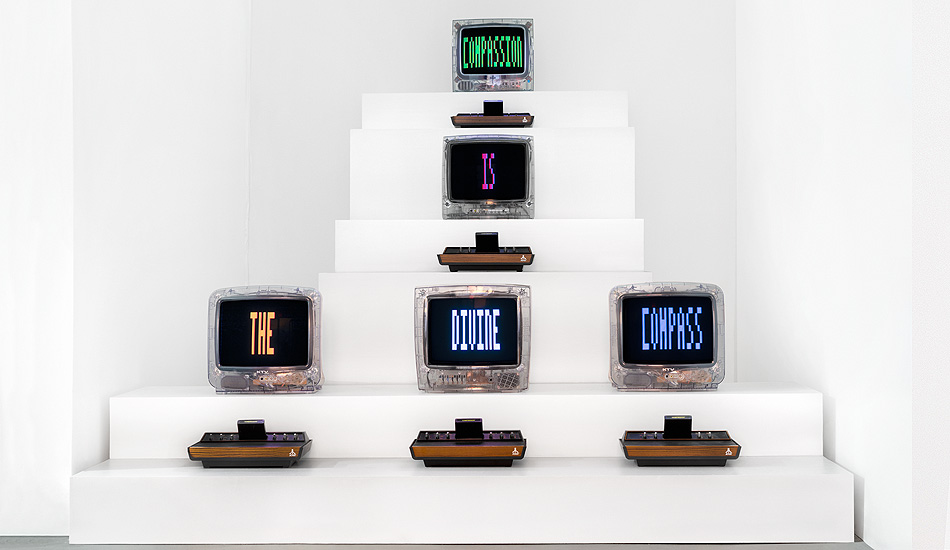 Compassion is an installation made in 2020 during the global confinement. It is comprised of five CRT TVs with transparent cases connected to five Atari 2600 game consoles (circa 1977). Each game device holds an Atari cartridge programmed and assembled by the artist during the confinement year. Together, the TV monitors display the phrase "Compassion is the Divine Compass", an epiphany that the artist devised while meditating. The work is permeated with the looping sound of Tibetan bells.