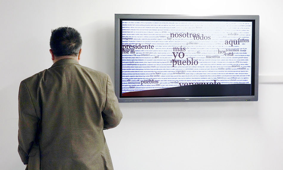Words appear on red color and move from left to right within twenty dynamic lines. The software generates new discourses based on the word's frequency of occurrence. Some words grow in size or vanish depending of their recurrence, generating a new speech. The result can be described as an endless Dadaist poem which points out the current political scenario of Venezuela and South America.