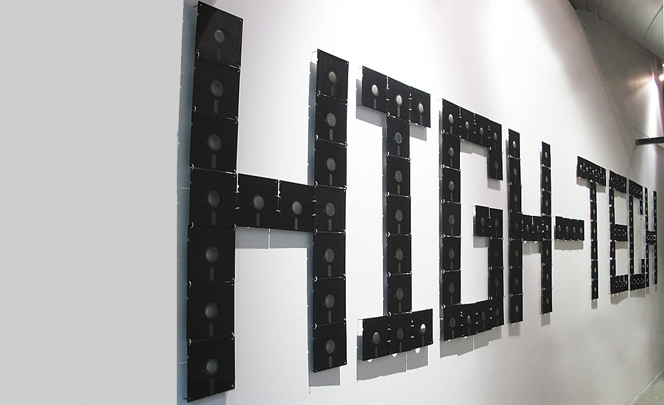 High-Tech epitomizes a paradox that has been present in our society since the uncontrolled growth of new technologies, particularly computer related technologies. It is comprised by one-hundred twenty 5 ¼ floppy disks connected by small metal rings, displaying the word “High-Tech.”