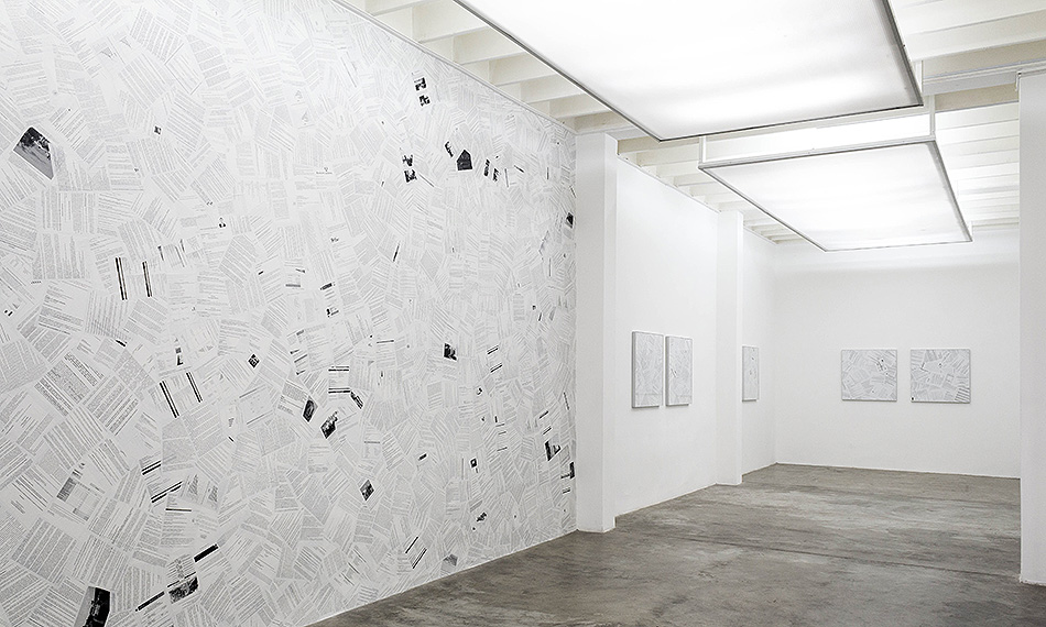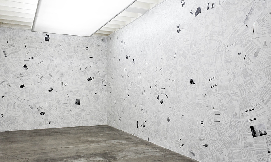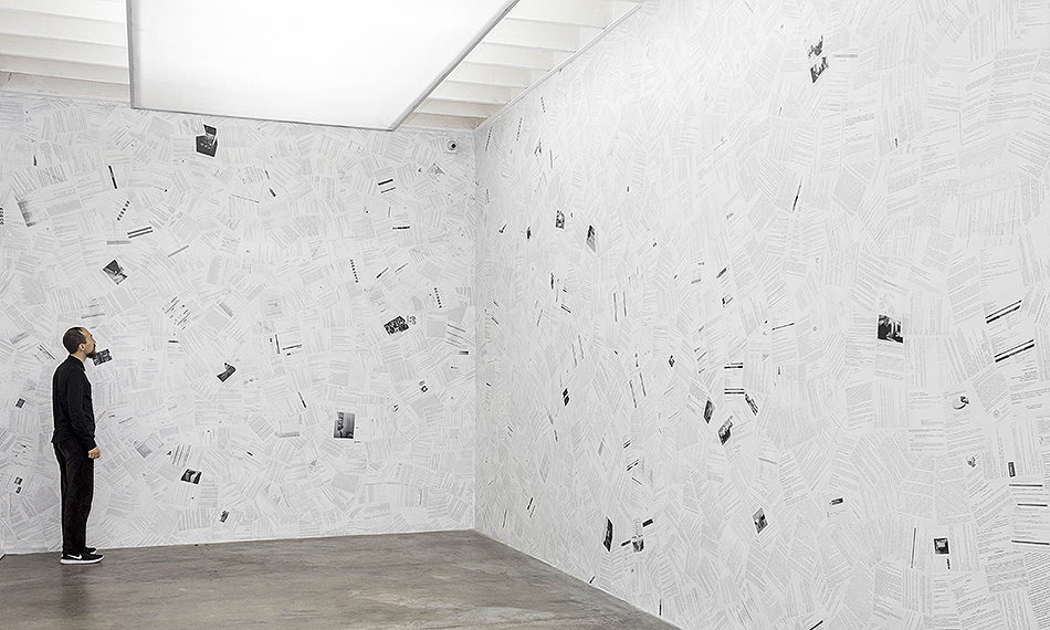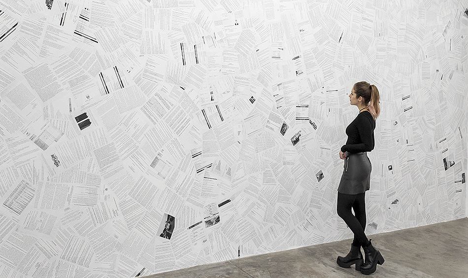 The information employed in this work was arranged using a spatial array system known as datagram, devised by Merhi in 1998. The artist printed and scattered the data by applying a geometric pattern subject to the content relevance, becoming an intermediary between the people who wrote the messages and the viewers. The result is an immersive and monumental wallpaper installation that can be explored in many different ways.