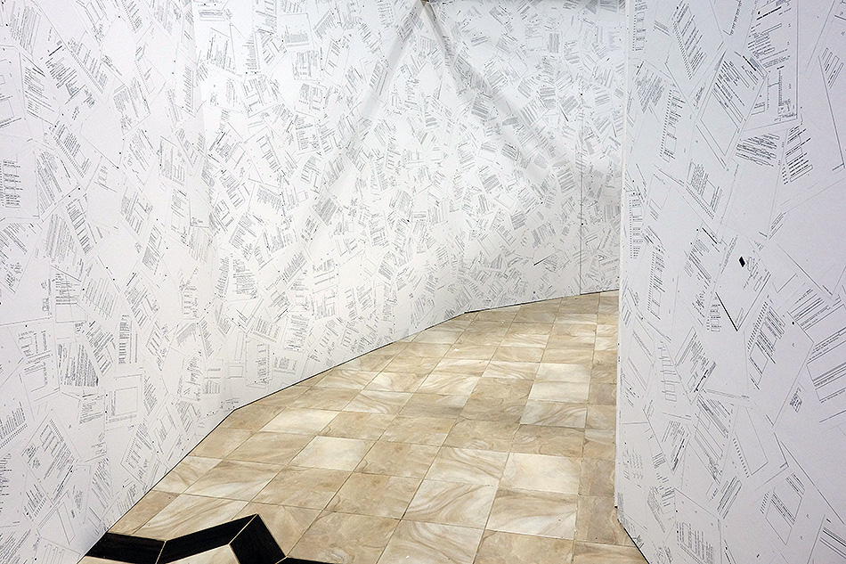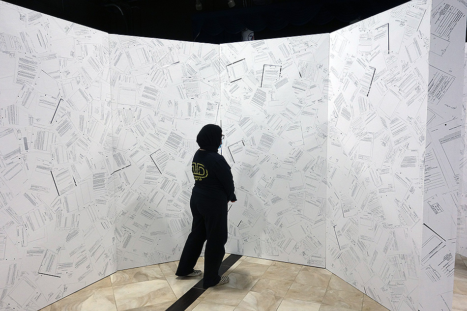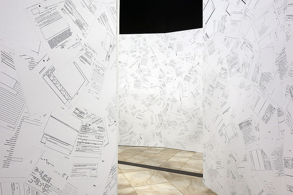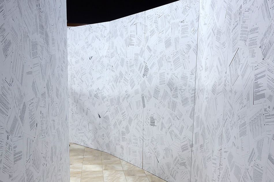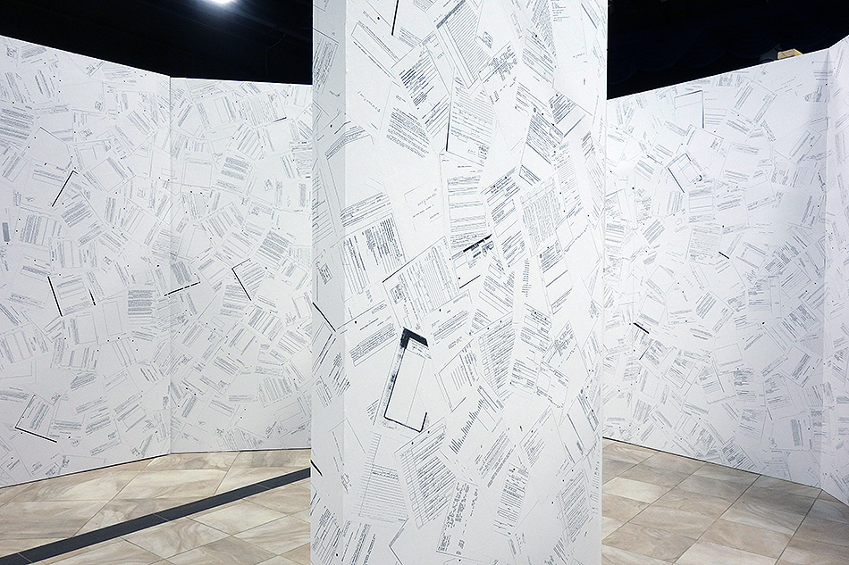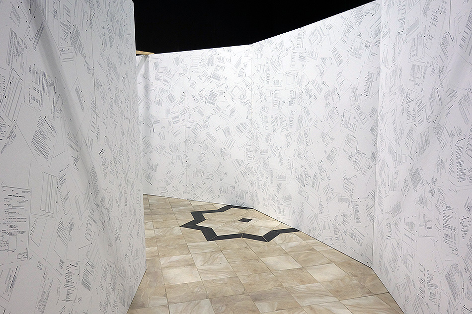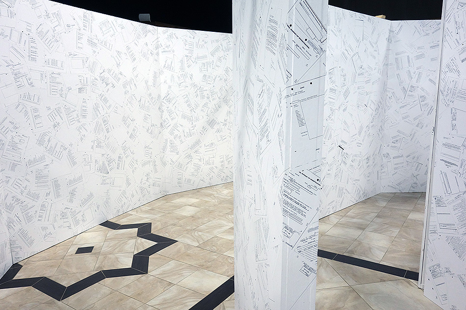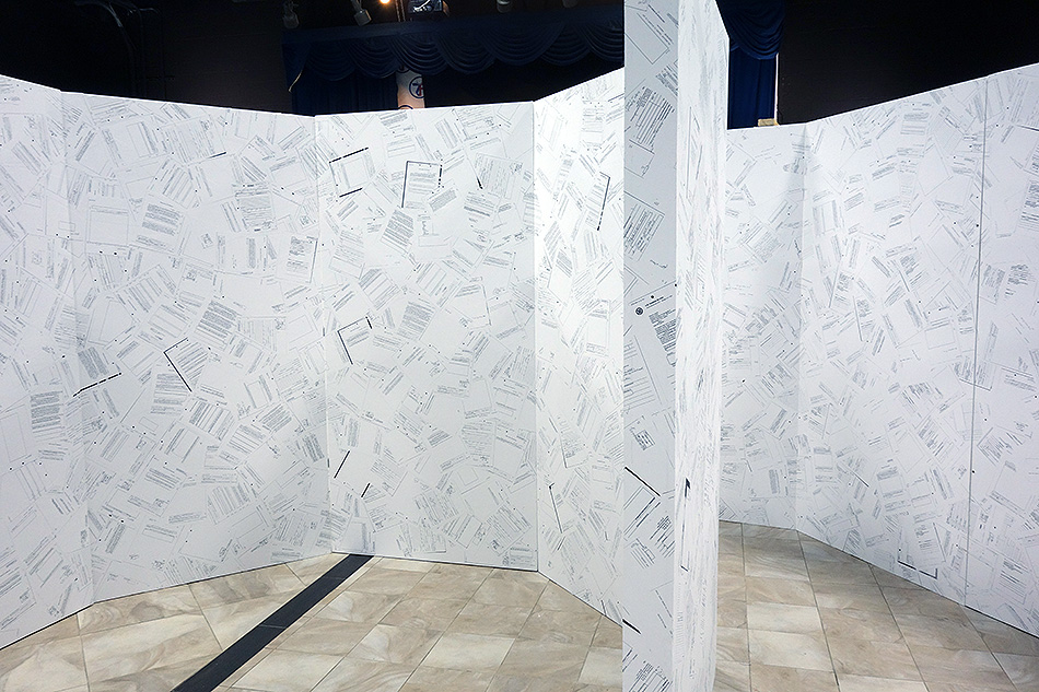 Inverse Security is a monumental immersive installation of 35 x 35 x 8 ft. that takes the shape of a tri-circular labyrinth comprising nearly 10,000 pages of declassified government records which were obtained via the Freedom of Information Act federal lawsuit, Boundaoui v. FBI.