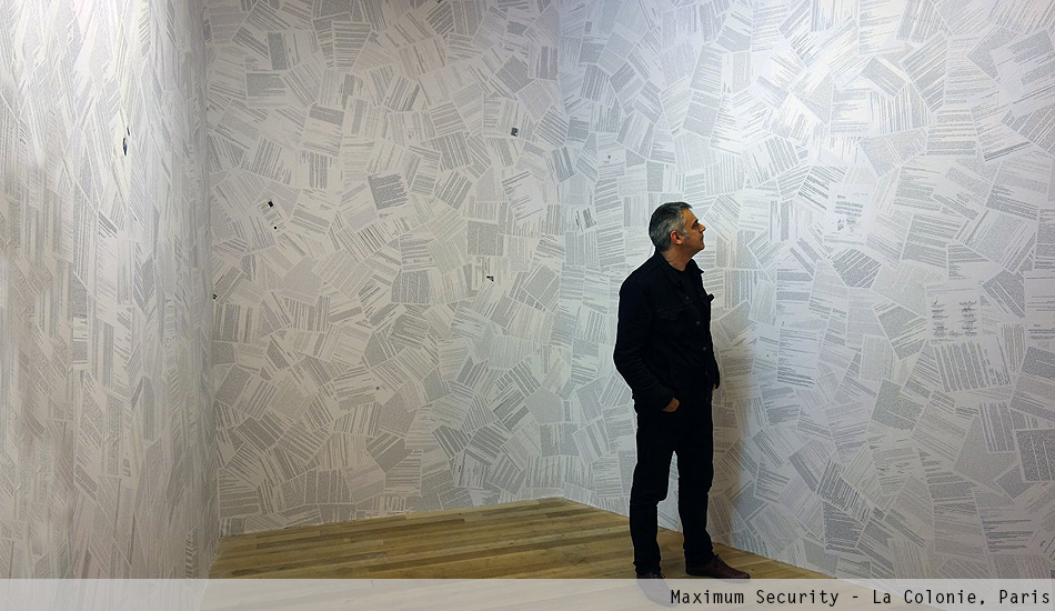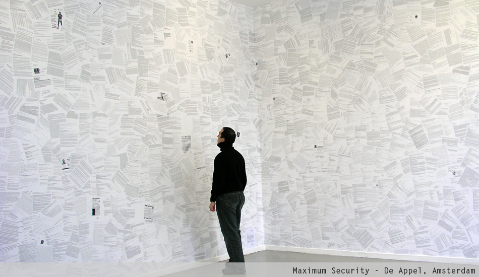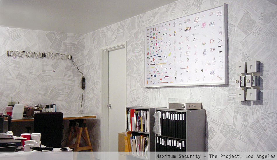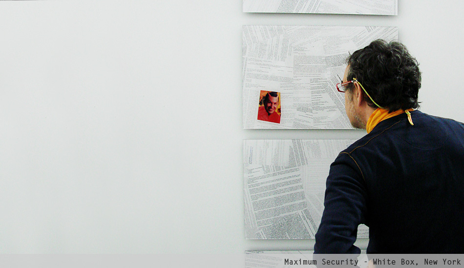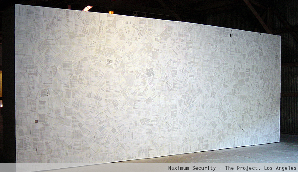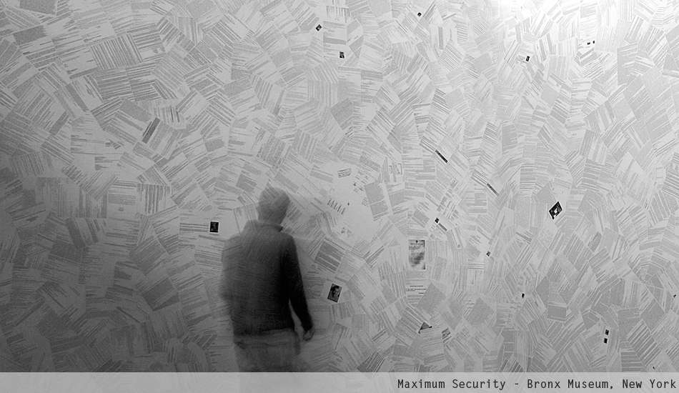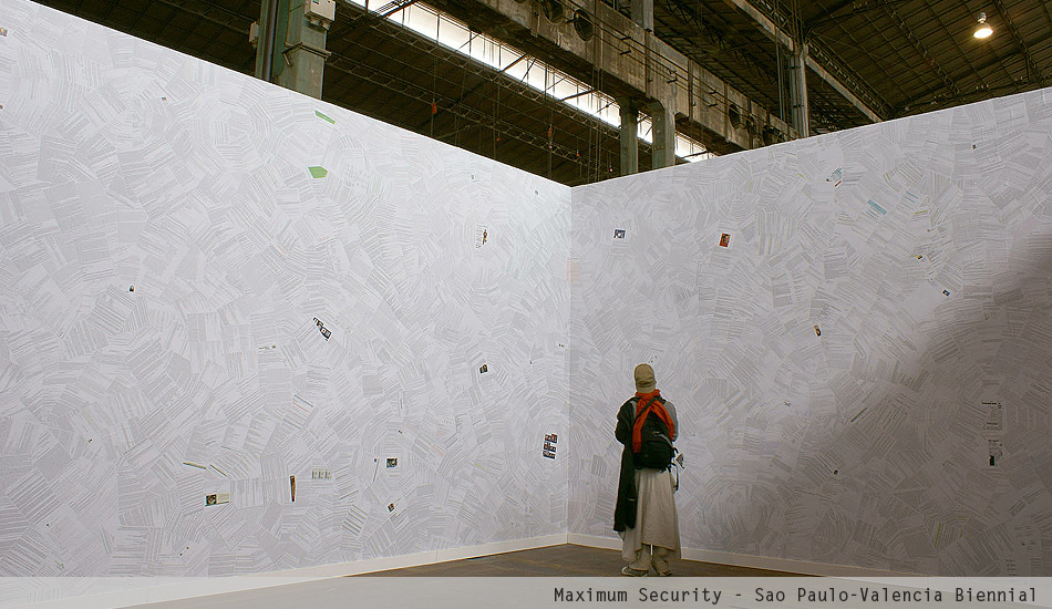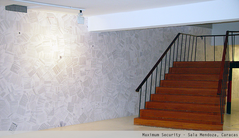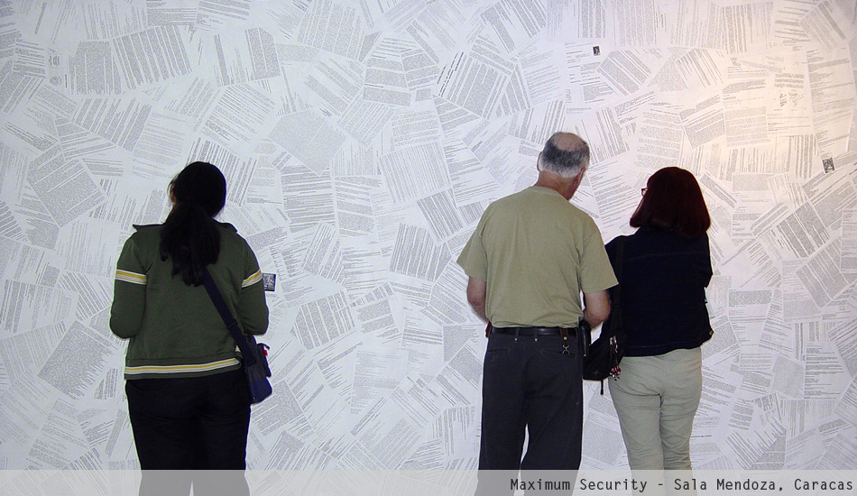 Maximum Security is an immersive installation that displays the personal emails of the late President of Venezuela Hugo Chávez. The project began in 1998 when Merhi hacked into Chávez' email account. At that time, Chávez still was a candidate for President. The artist kept intercept his emails until 2004. Then, he arranged the information using a spatial array system known as datagram. Fundamentally, Merhi printed and scattered the data using a procedural pattern. The result is a monumental wallpaper installation.