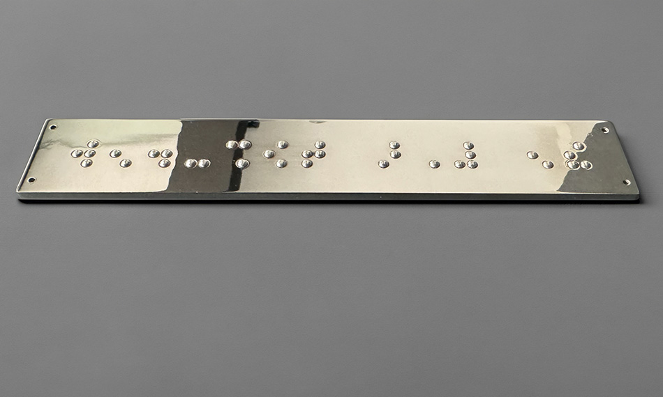 Ne Pas Toucher is a plaque with a polished aluminium finish that has been engraved with the sentence Ne Pas Toucher (Do Not Touch) in braille, a tactile writing system used by people who are visually impaired.