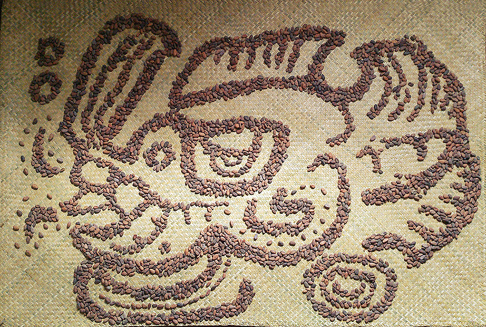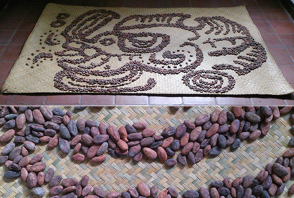 In the case of Perfect Language (Cacao: Kakaw), the artist employed Guatemalan cacao beans (theobroma cacao) to compose the logogram of Cacao. Beans were placed over a petate. Since prehispanic times, petates have been used for drying seeds and grains in the sun.