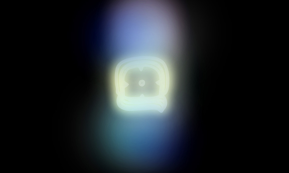In the case of Perfect Language (Light: K'in), the artist found out that there is no glyph to represent the word 'light' as we know it. The closest Maya glyph which refers to light is the one that alludes to the sun. Merhi programmed an algorithmic software to show this logogram glowing in an empty space, surrounded by an endless aurora.