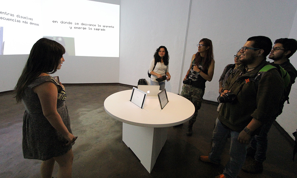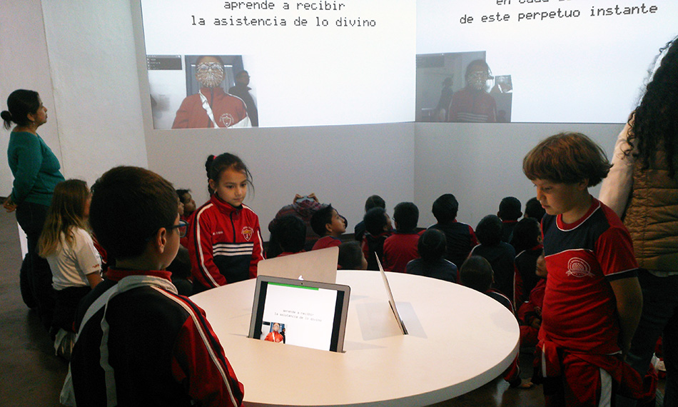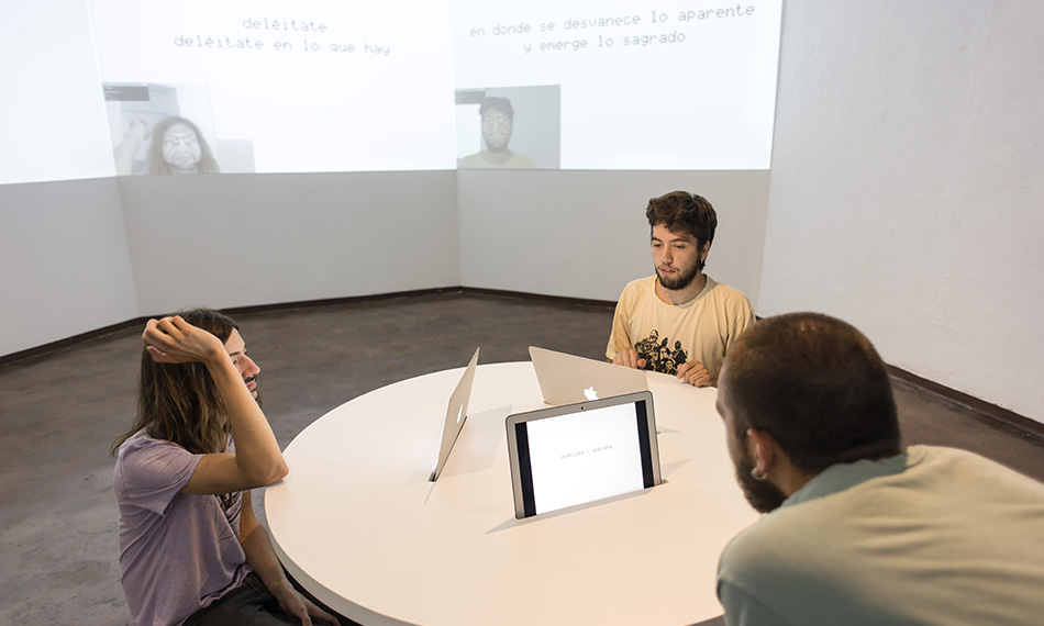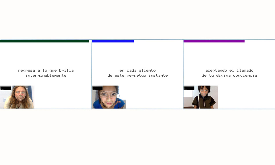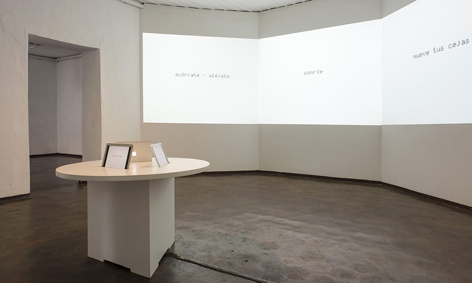 Poesía Facial is an interactive installation that includes three computers equipped with facial recognition software that Merhi coded. This enables each computer to recognize three distinct facial features: eyebrow movements, mouth gestures, and face's overall appearance on screen. Once the computer's built-in camera identifies these features, the system activates and displays phrases from the artist's poems and sound frequencies.