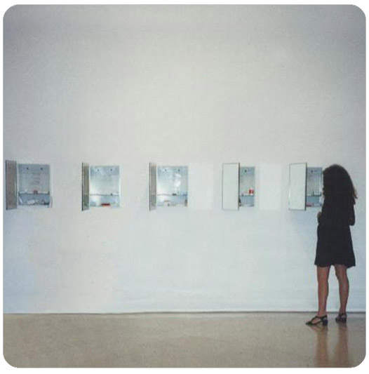 Poliverso Andróctono (1997) is a participatory installation consisting of bathroom cabinets filled with drugs and poems. Each cabinet contains a poem that can be read when the glass door is open. The poems were written by Merhi in the mid-90s. They refer to the relationship between the poet and death, a theme that has remained prevalent in Yucef's work as a writer. Boxes of antidepressants, sedatives and barbiturates, such as Prozac, Lexotanil, Seconal, Lexapro, Demerol, and so on, fill the shelves of the bathroom cabinets. The drugs were obtained from hospitals, private clinics, and friends.
