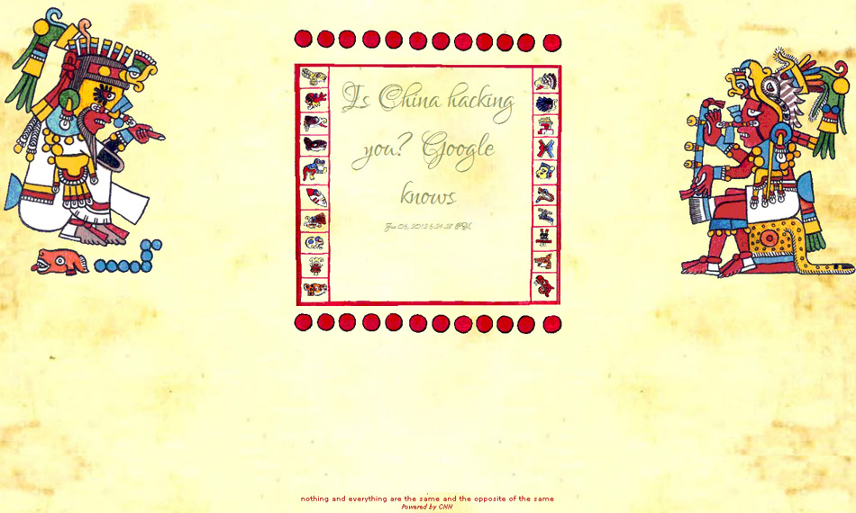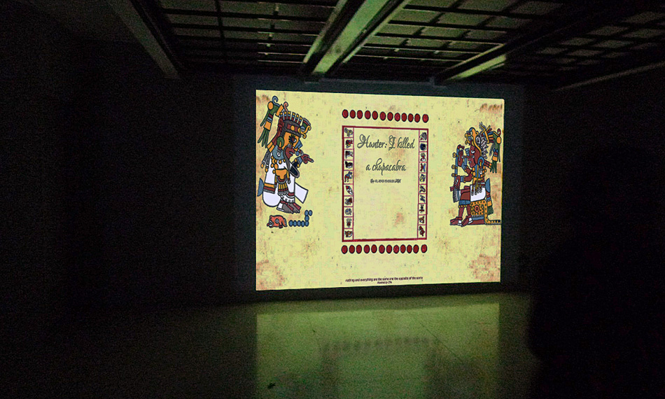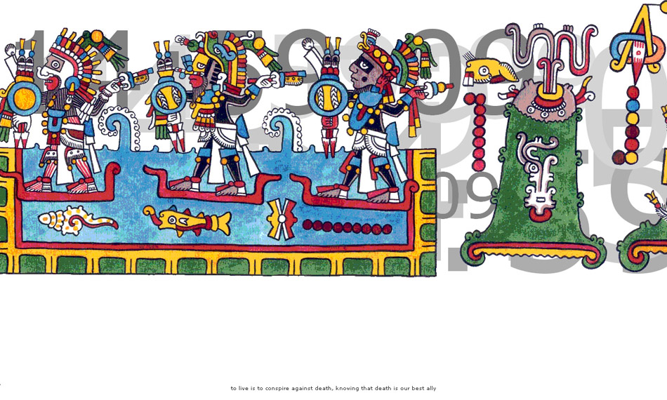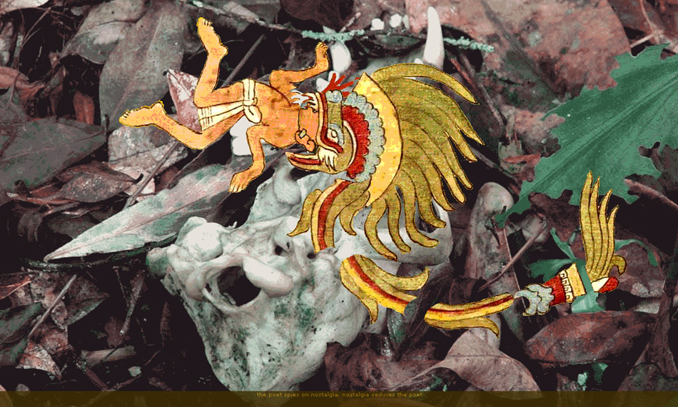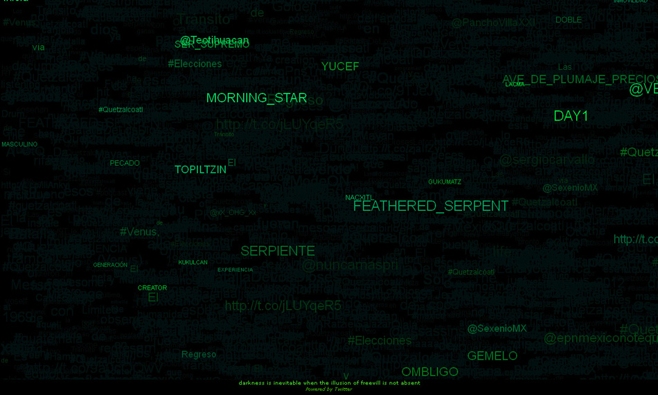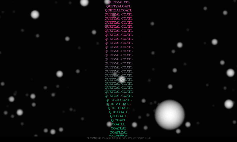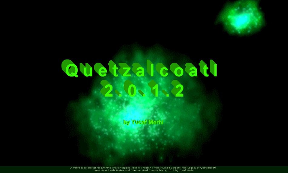 Quetzalcoatl 2.0.1.2 is and Internet-based work comprised by several dynamic projects. Each project evokes in a contemporary way the ancient experience of a ubiquitous but discernible god known by the Aztecs as Quetzalcoatl. Historical and cultural symbols are mixed with present-day signs and elements generated on realtime: changing tweets, instant news, stock market quotes, and so on.