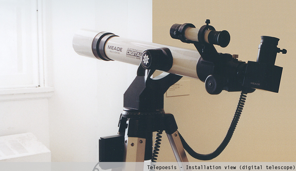 Telepoesis is an installation comprised of a digital telescope and a poem printed on a plaque. The poem, placed far from the telescope, only can be read through the telescope. For the 2002 Biennial that took place at El Museo del Barrio in New York, Merhi fixed the plaque on the top of the main gate of Central Park's Conservatory Garden, located in front of the Museum. The gate, forged in Paris in 1894 for the Vanderbilt mansion, was given by Gertrude Vanderbilt Whitney, founder of the Whitney Museum, to the City of New York in 1939. Merhi installed the telescope in front of a gallery window and pointed the telescope at the plaque.