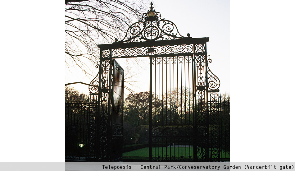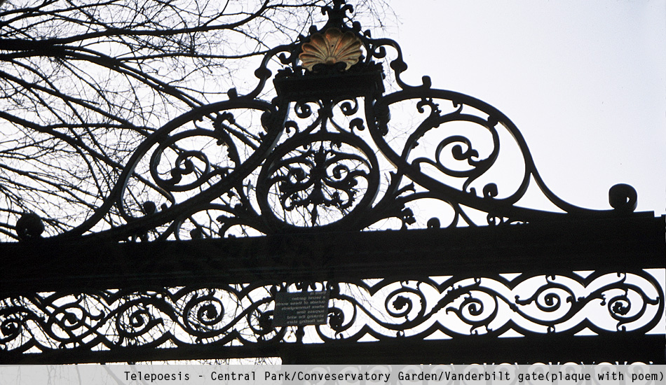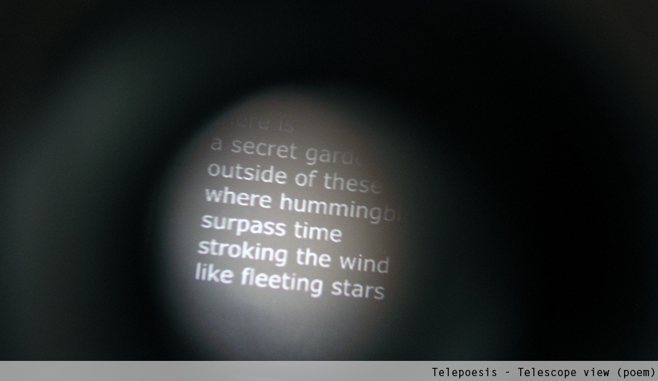 With Telepoesis the outside and inside space fade out. In this context, the museum functions as an agency to access the text situated beyond its own boundaries. The poem, written by the artist at the Conservatory Garden, becomes a metaphoric mirror that can be seen from the distance, mediated by technology. Poetry, of course, plays a vital role since the poem is in itself the work of art. And the act of reading the poem turns into a poetic experience.