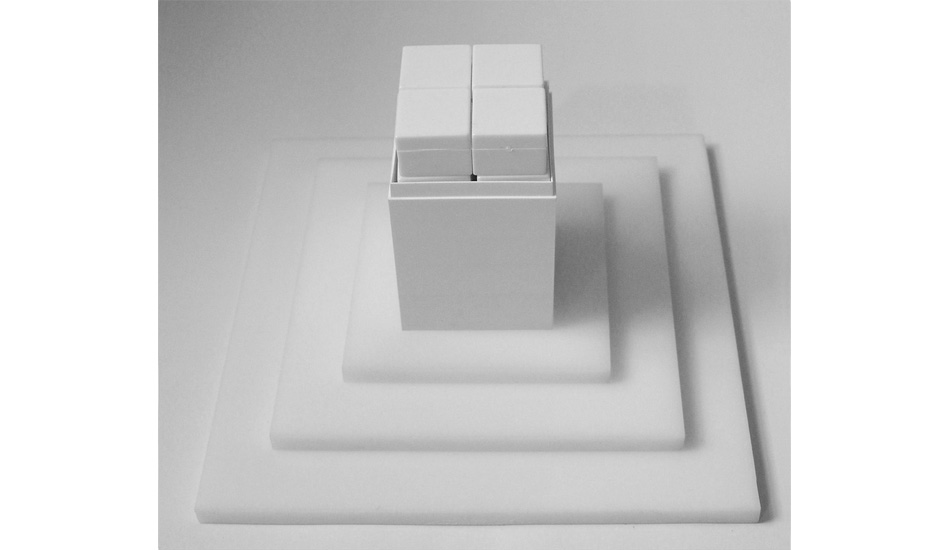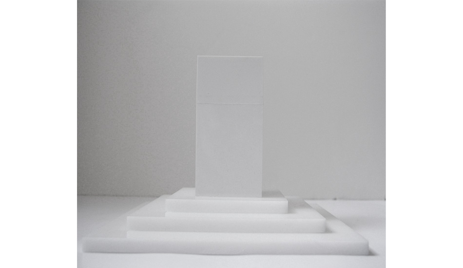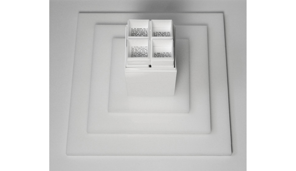 White on White on White is a modular sculpture made by 20 Plexiglas boxes introduced in a white rectangular Plexiglas parallelepiped that rests over 3 white Plexiglas flat squares. At the end of each box there is a concept of white taken from the dictionary.