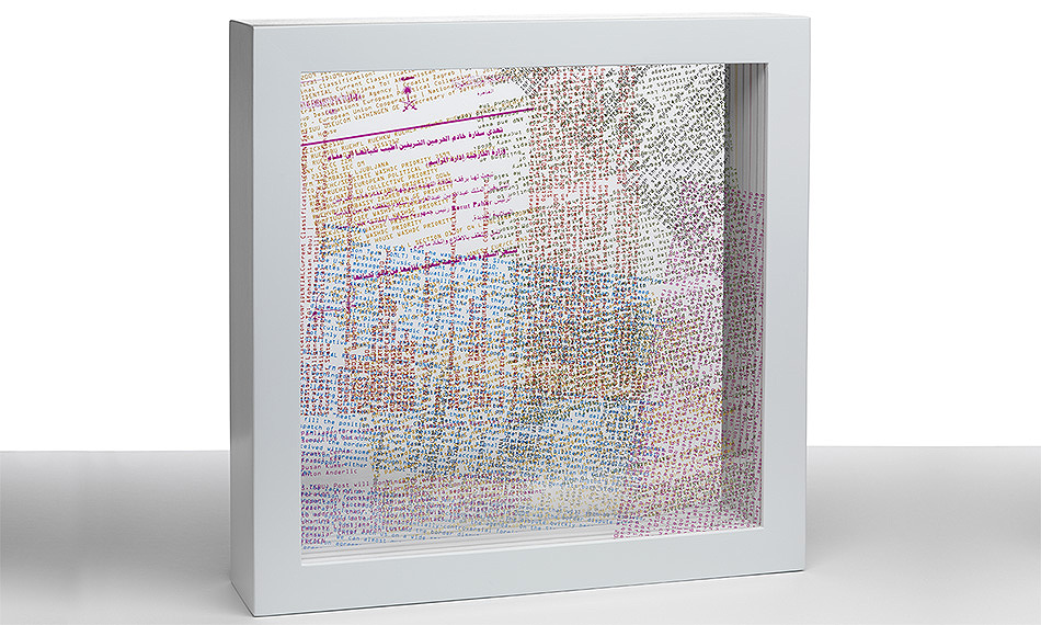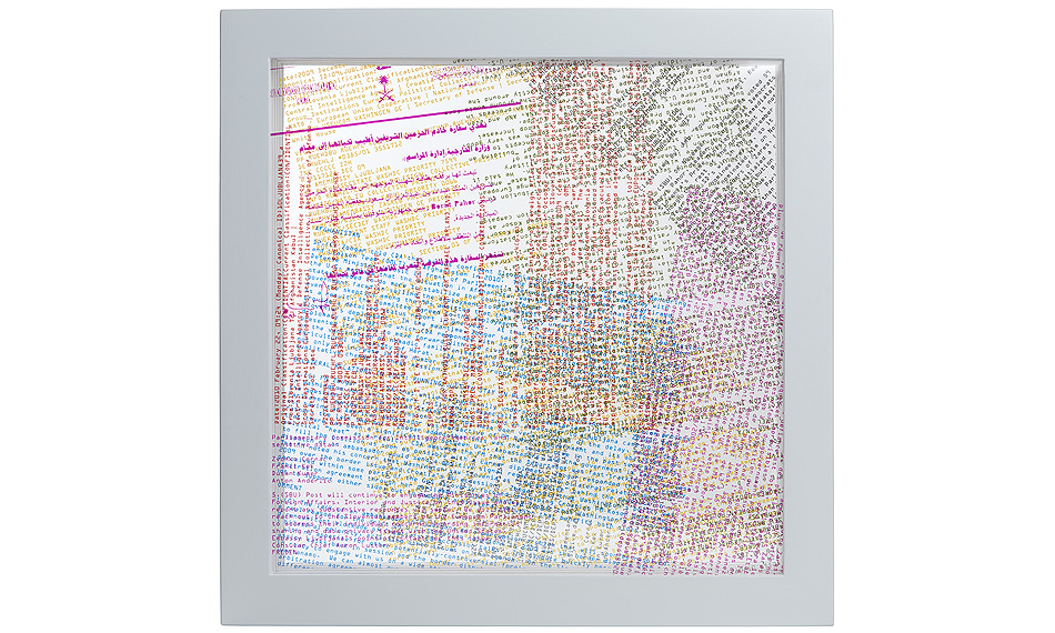 The piece was made out of 6 transparent sheets of Plexiglas, arranged inside of a white box of 30 x 30 cm. Each layer has readable data printed in a unique color (magenta, blue, green, red, yellow and black).